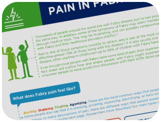 Download this factsheet to provide you with information on the pain that may be associated with Fabry disease. The factsheet looks at the effects of Fabry pain, frequent locations of the pain and potential management approaches.